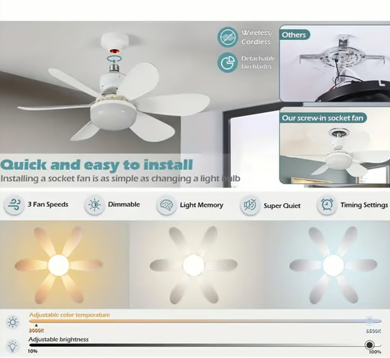 Simply remove the bulb out of the socket, screw in Socket Fan, press the remote, and instantly you're enjoying cool air!