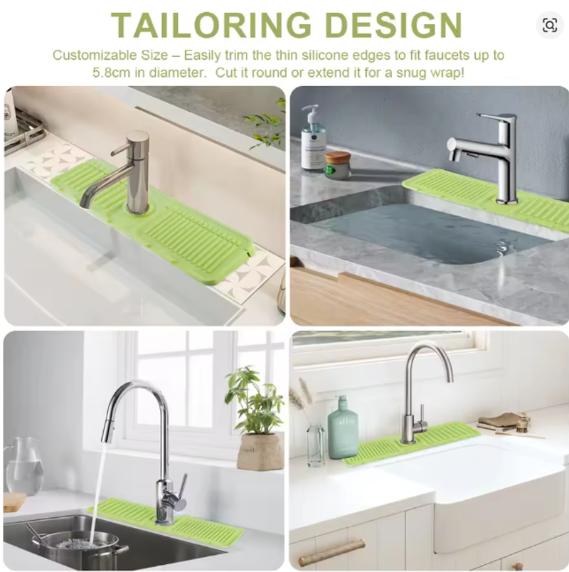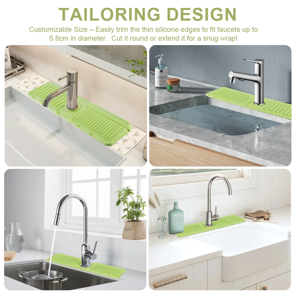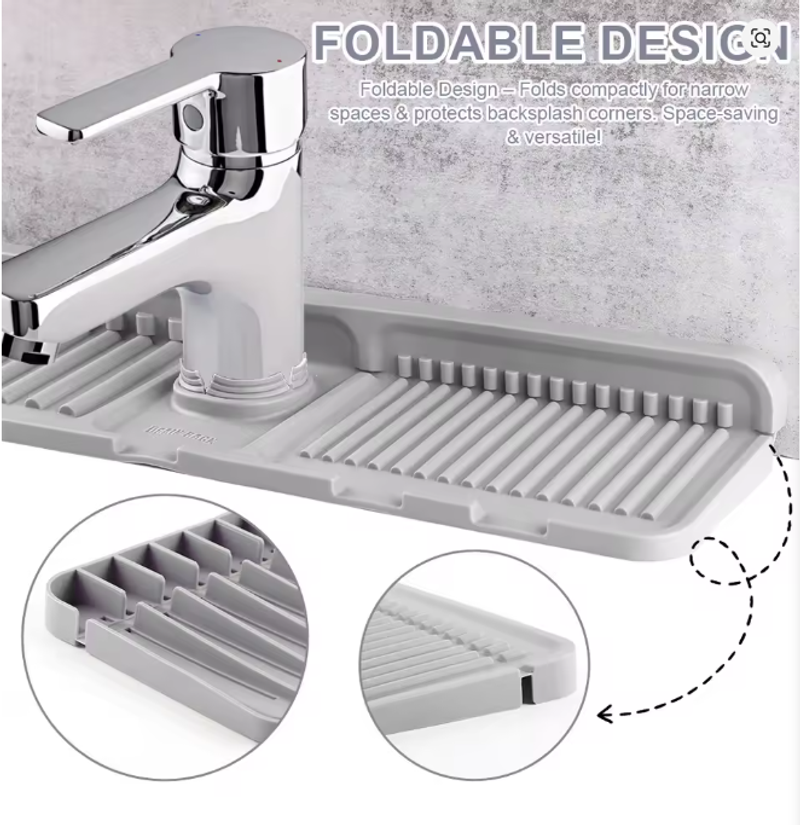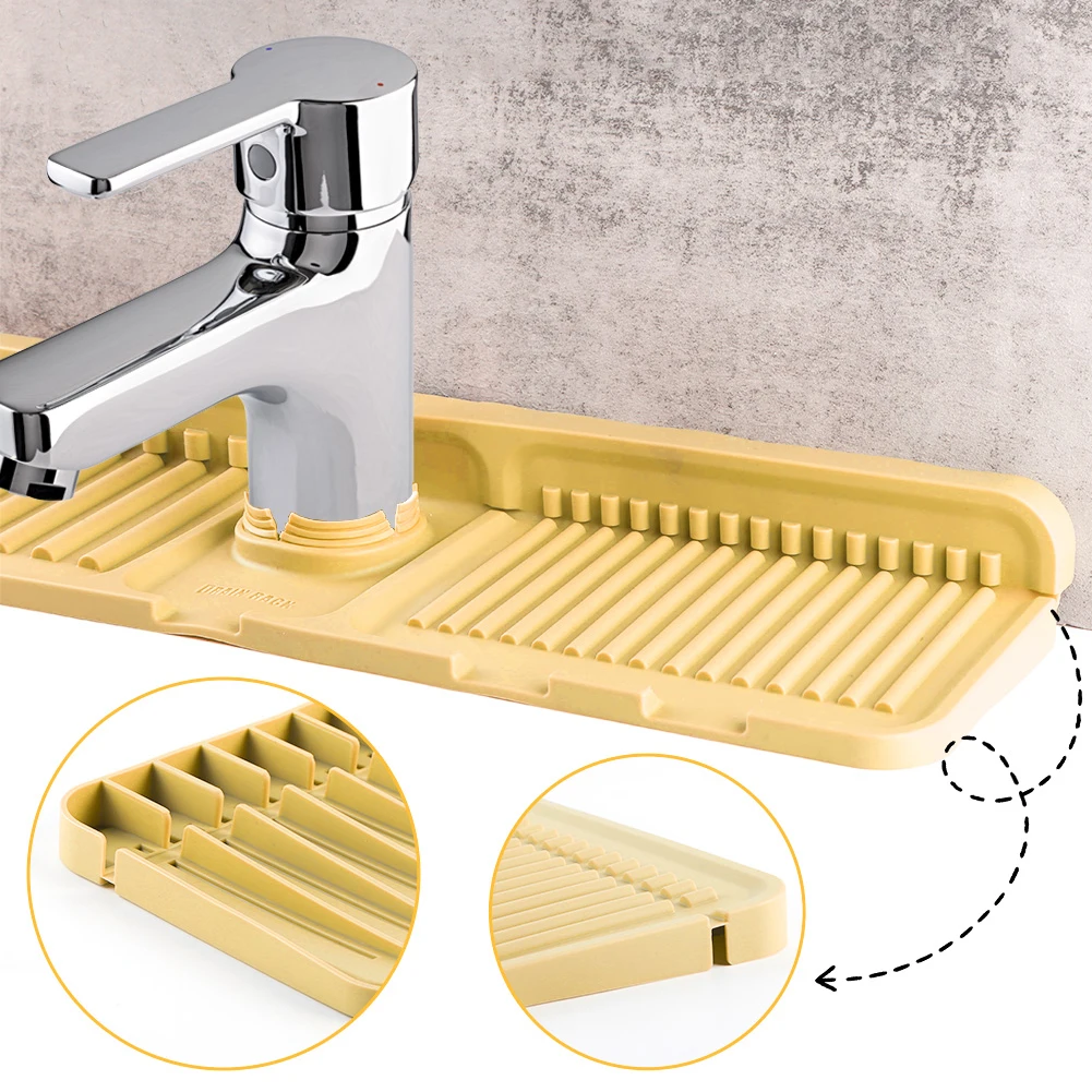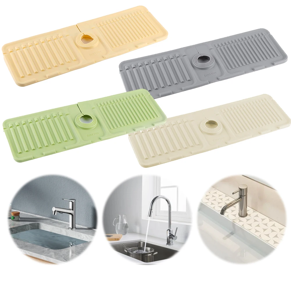 | | (Grey 45x14x1.6cm/Beige 45x14x1.6cm/Green 45x14x1.6cm/Yellow 45x14x1.6cm)--Sink Splash Guard | Silicone Drip Catcher Tray Quick Dry Water Catcher Mat Multi-Purpose Water Drainer Mat Faucet Drainage Pad for Kitchen Bathroom Features: 1. Splash Guard with Drip Tray: This silicone sink splash guard effectively prevents water from splashing out, keeping countertops and sinks clean and dry. Simplify your kitchen cleaning routine by reducing the need for frequent wiping of sink surfaces. 2. Fast and Efficient Drainage: Featuring a streamlined design, this drip catcher tray allows for quick drainage along fixed channels. The integrated drip tray directs excess water directly into the sink, preventing puddles and ensuring a flat, dry surface. 3. High-Quality Silicone Material: Made from food-safe, non-toxic silicone, this water catcher mat is strong and resistant to cracking or deformation. The non-slip surface ensures stability, preventing dishes or glasses from slipping during drainage. 4. Easy to Clean and Maintain: With a smooth, reusable surface, this water drainer mat is easy to clean and maintain. Simply rinse under running water or place it in the dishwasher for a quick and thorough cleaning. 5. Versatile and Adaptable Design: The foldable design with a cuttable center hole fits various faucets, making the faucet drainage pad suitable for kitchens, bathrooms, RVs, outdoor sinks, and more. Use it to hold toothbrushes, cups, soap, or sponges, preventing water buildup and keeping countertops tidy.