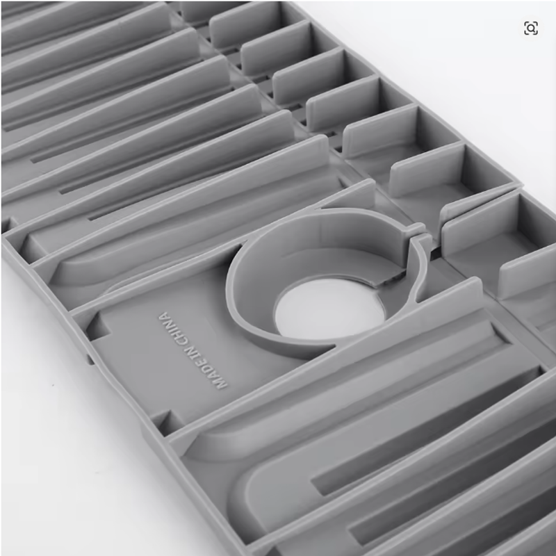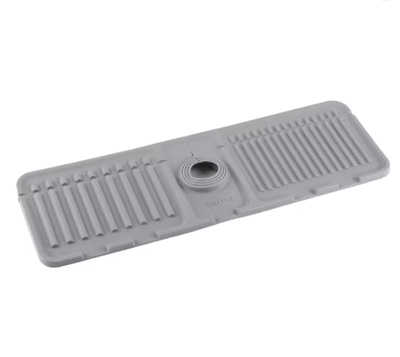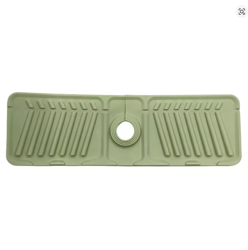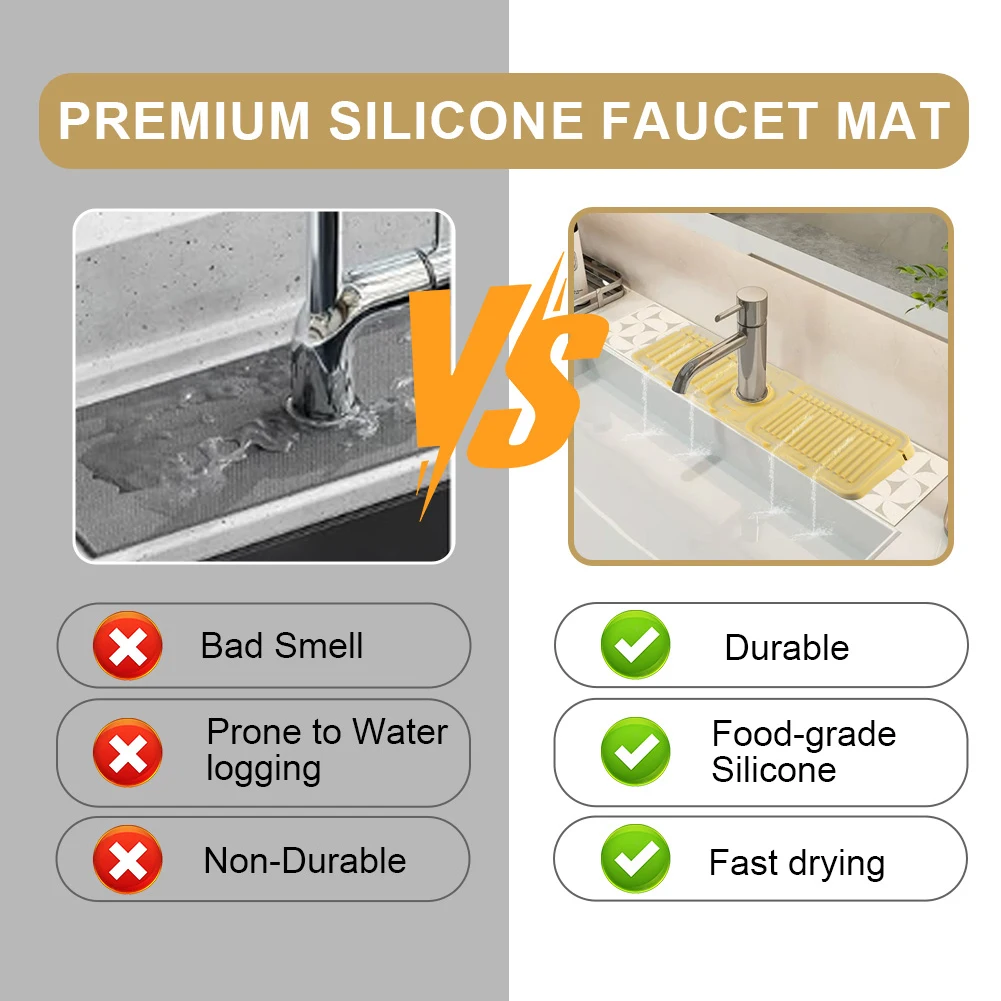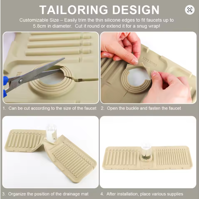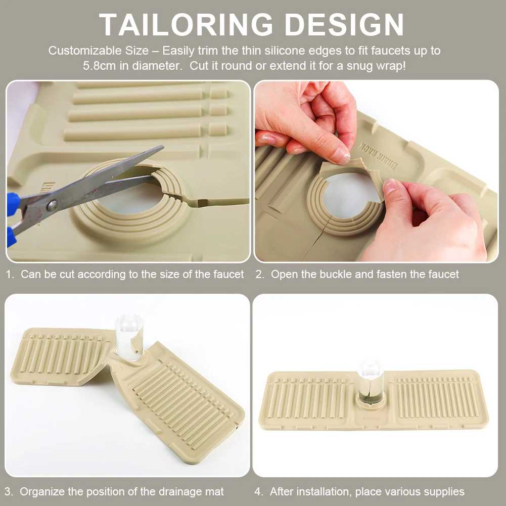 | | (Grey 45x14x1.6cm/Beige 45x14x1.6cm/Green 45x14x1.6cm/Yellow 45x14x1.6cm)--Sink Splash Guard | Silicone Drip Catcher Tray Quick Dry Water Catcher Mat Multi-Purpose Water Drainer Mat Faucet Drainage Pad for Kitchen Bathroom Features: 1. Splash Guard with Drip Tray: This silicone sink splash guard effectively prevents water from splashing out, keeping countertops and sinks clean and dry. Simplify your kitchen cleaning routine by reducing the need for frequent wiping of sink surfaces. 2. Fast and Efficient Drainage: Featuring a streamlined design, this drip catcher tray allows for quick drainage along fixed channels. The integrated drip tray directs excess water directly into the sink, preventing puddles and ensuring a flat, dry surface. 3. High-Quality Silicone Material: Made from food-safe, non-toxic silicone, this water catcher mat is strong and resistant to cracking or deformation. The non-slip surface ensures stability, preventing dishes or glasses from slipping during drainage. 4. Easy to Clean and Maintain: With a smooth, reusable surface, this water drainer mat is easy to clean and maintain. Simply rinse under running water or place it in the dishwasher for a quick and thorough cleaning. 5. Versatile and Adaptable Design: The foldable design with a cuttable center hole fits various faucets, making the faucet drainage pad suitable for kitchens, bathrooms, RVs, outdoor sinks, and more. Use it to hold toothbrushes, cups, soap, or sponges, preventing water buildup and keeping countertops tidy.