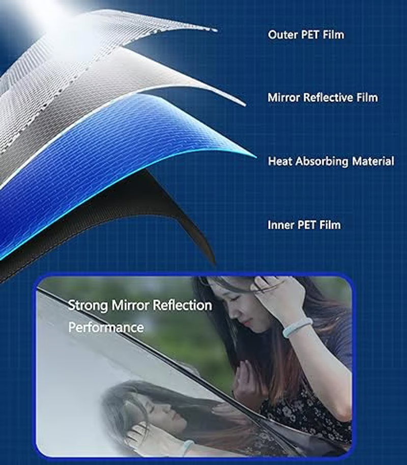 Comprising of 4 layers of thickened PET film, this windshield cover sun shade's independent sunshade effectively blocks 99% harmful UV rays. Once installed, your car's interior remains shielded from sunlight.