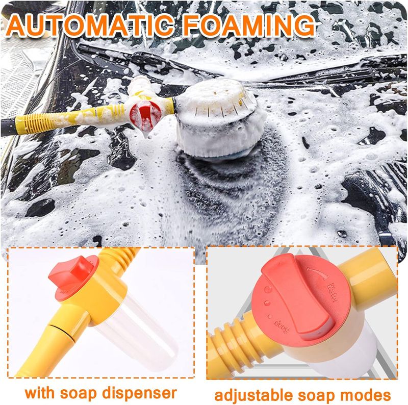 Simplify your car washing routine with this automatic rotary foam brush. Featuring a 360° rotating head powered by water pressure, soft chenille material, and an integrated foaming system, this multipurpose cleaning mop ensures a thorough and scratch-free clean for cars, windows, and more.