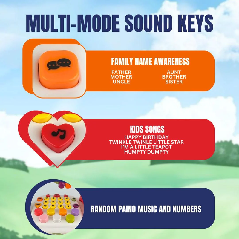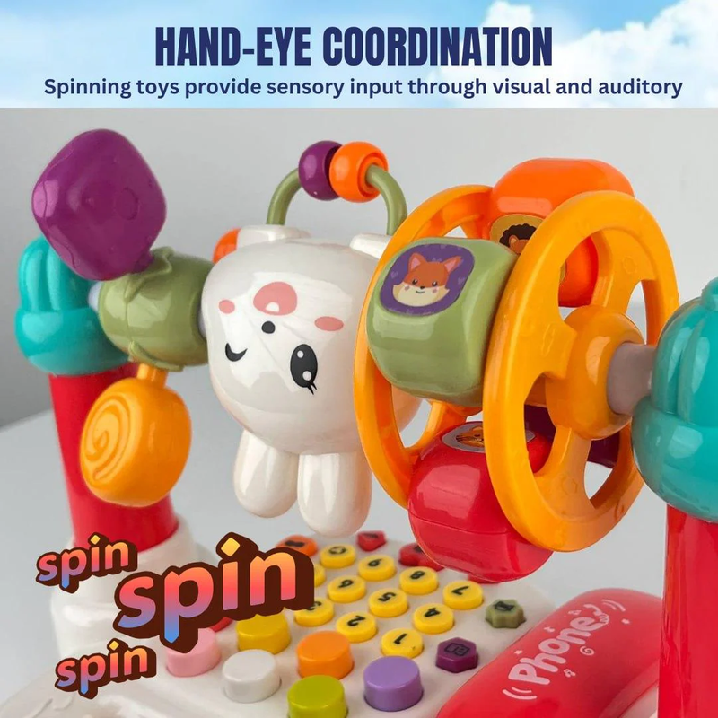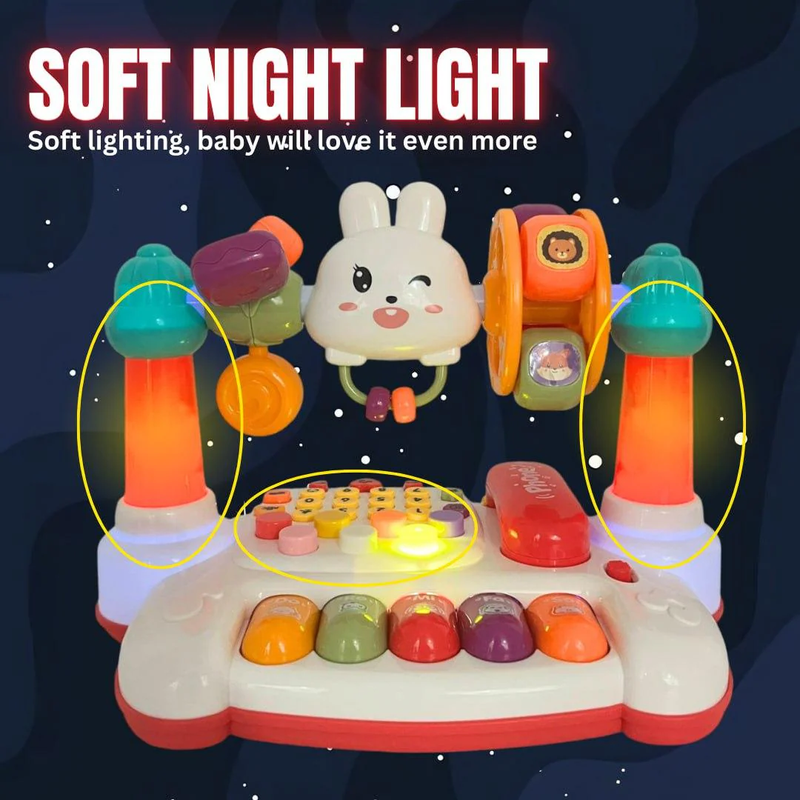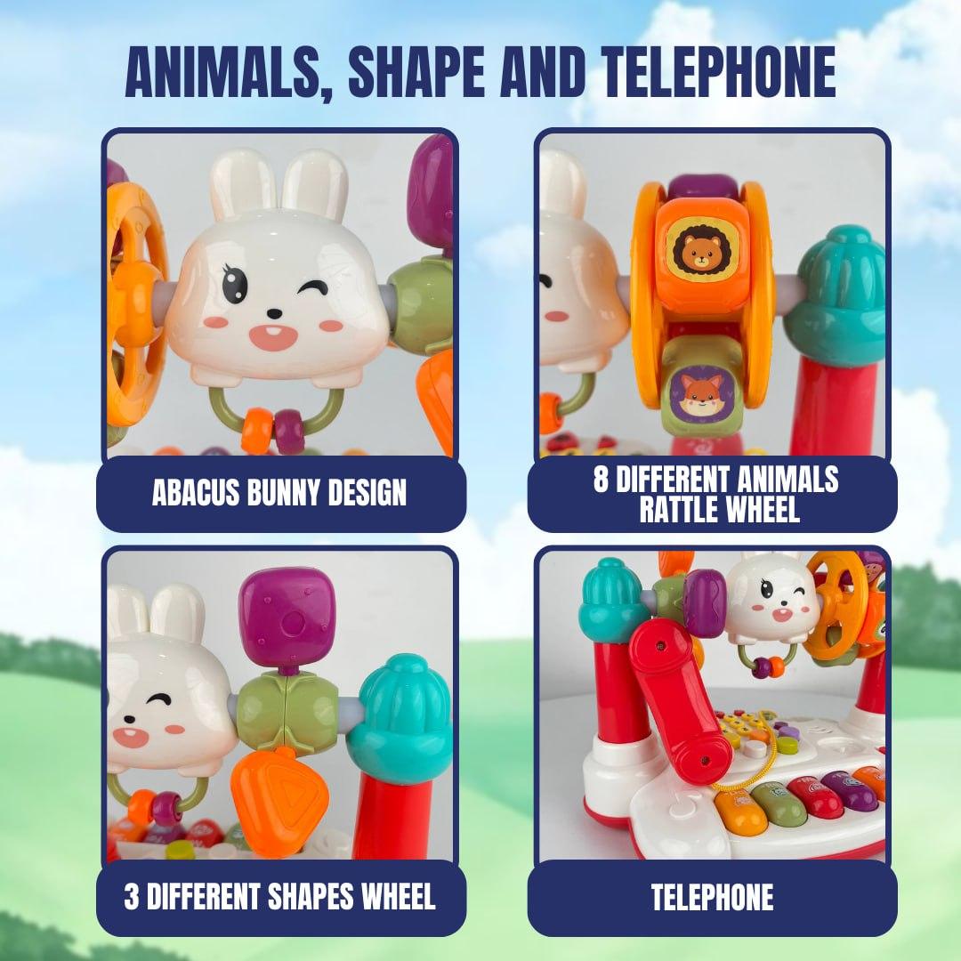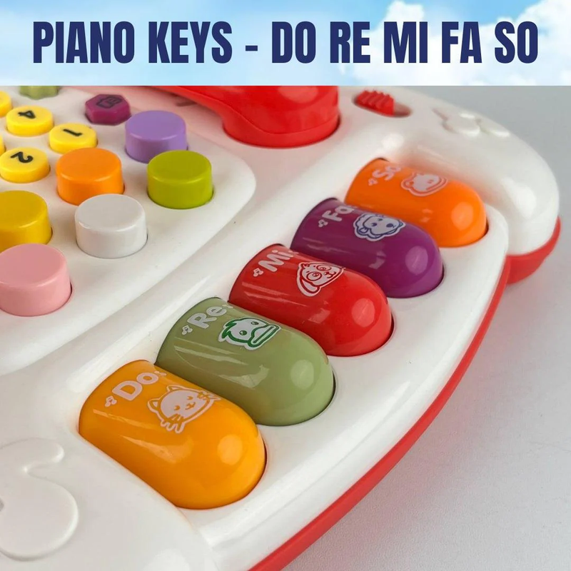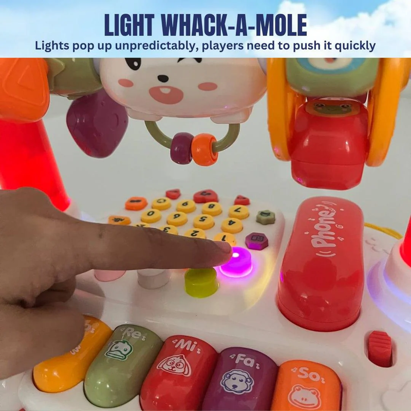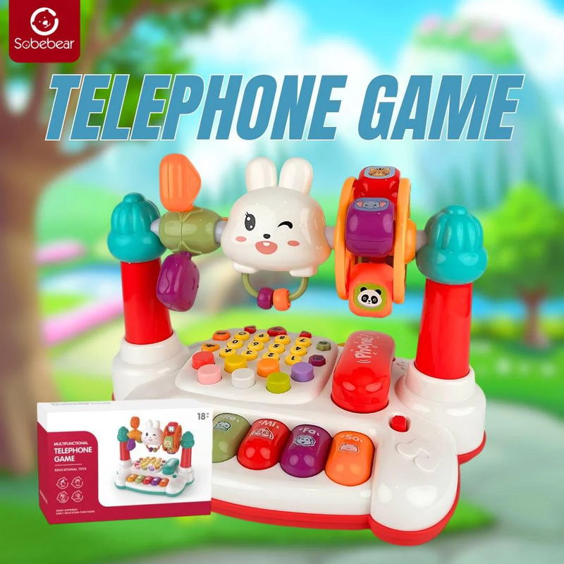 Early childhood toys for boys and girls that have multiple functions, like a rotary music telephone, a banging piano sound, and light music storytelling